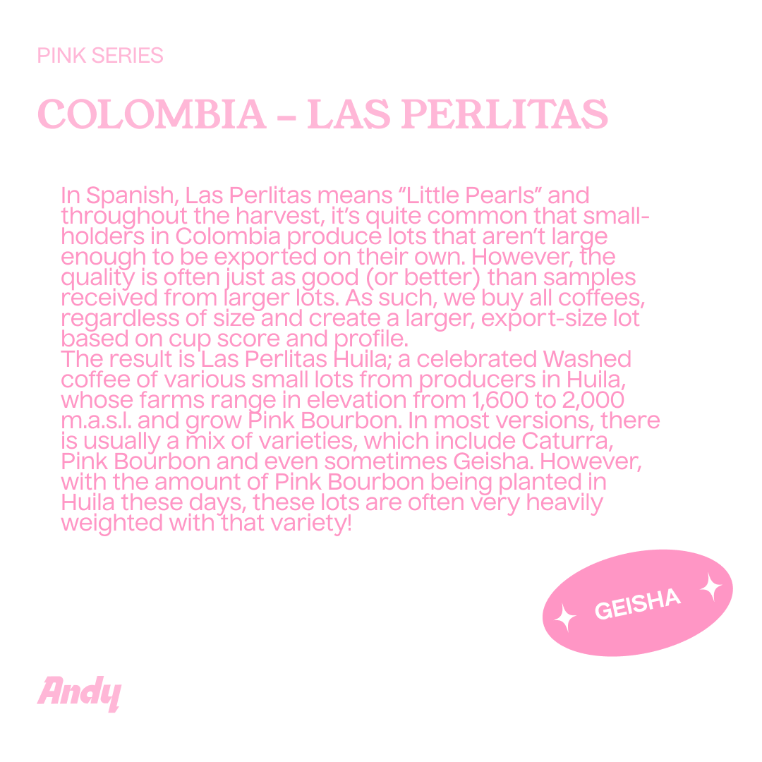 In Spanish, Las Perlitas means “Little Pearls” and throughout the harvest, it’s quite common that small-holders in Colombia produce lots that aren’t large enough to be exported on their own. However, the quality is often just as good (or better) than samples received from larger lots. As such, we buy all coffees, regardless of size and create a larger, export-size lot based on cup score and profile. The result is Las Perlitas Huila; a celebrated Washed coffee of various small lots from producers in Huila, whose farms range in elevation from 1,600 to 2,000 m.a.s.l. and grow Pink Bourbon. In most versions, there is usually a mix of varieties, which include Caturra, Pink Bourbon and even sometimes Geisha. However, with the amount of Pink Bourbon being planted in Huila these days, these lots are often very heavily weighted with that variety!